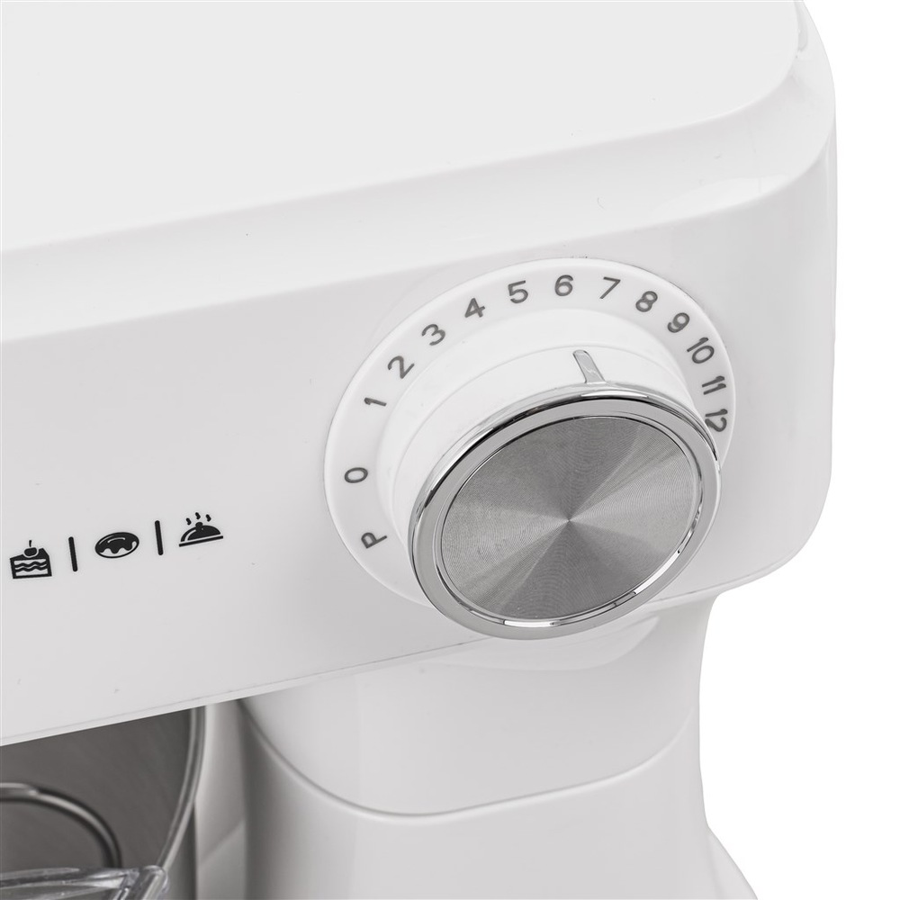 kuchyňský robot • příkon 600 W • objem hlavní nádoby 3,5 l • 12 rychlostí • planetární systém míchání • hnětení, míchání, šlehání • pulzní spínač • mechanické ovládání • gumové nožičky