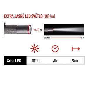 Uvnitř svítilny se nachází kvalitní CREE LED čip, který umožní dosvit až do vzdálenosti 65 metrů díky světelnému toku 100 lm. Svítilnu můžete používat v tmavých prostorech uvnitř i venku.