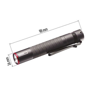 svítilna • světelný tok 100 lm • zdroj světla CREE LED • napájení 1× AAA baterie • dosvit max. 65 m • materiál: hliník • svícení max. 3 hod • 1 režim svícení • klip + poutko • nárazuvzdornost • voděodolnost IP65