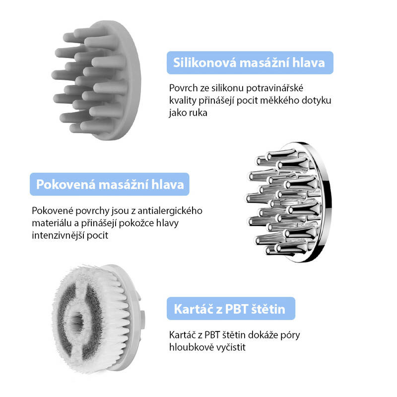 Silikonová hlavice přináší jemný relaxační dotyk. Pokovená masážní hlava je vyrobena z antialergického materiálu pro účinný pocit na vaší hlavě. Kartáček je určen pro hloubkové čištění obličeje.
