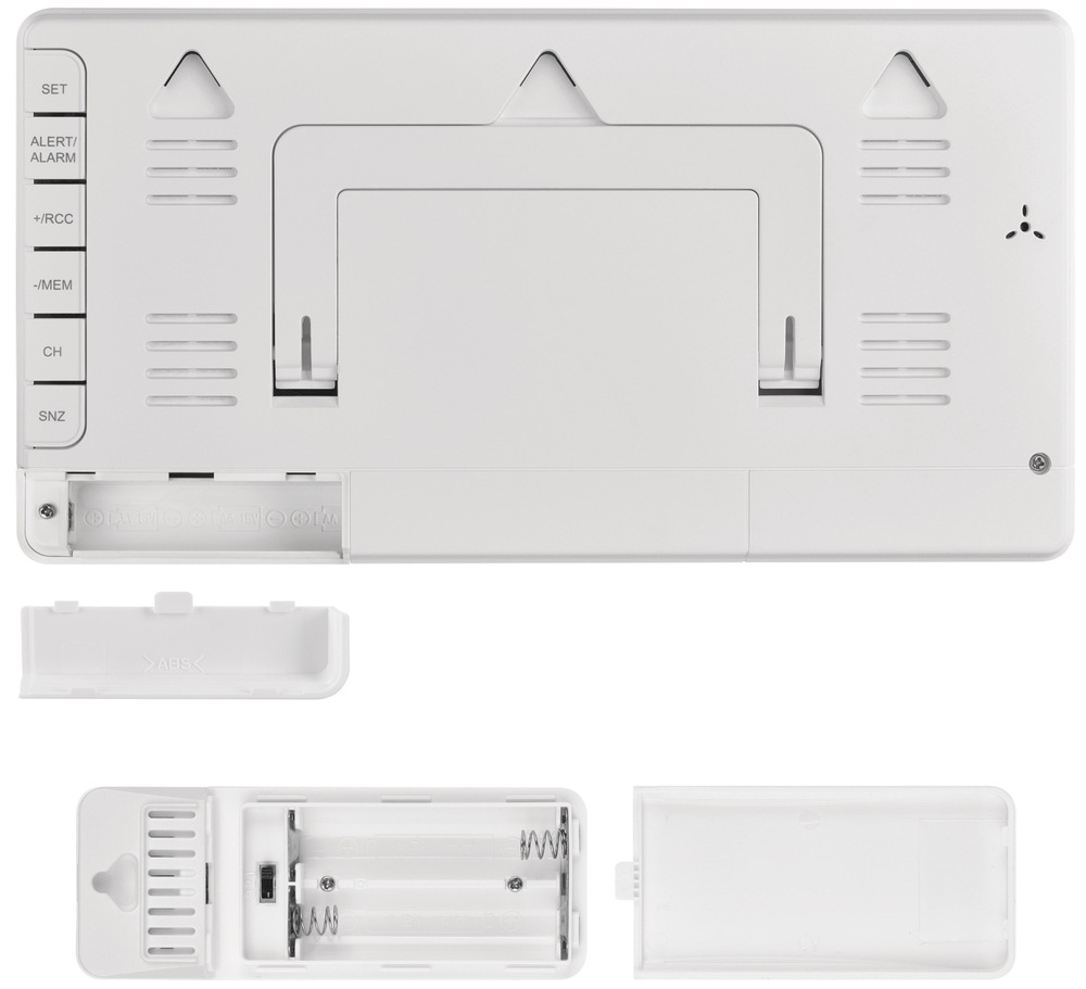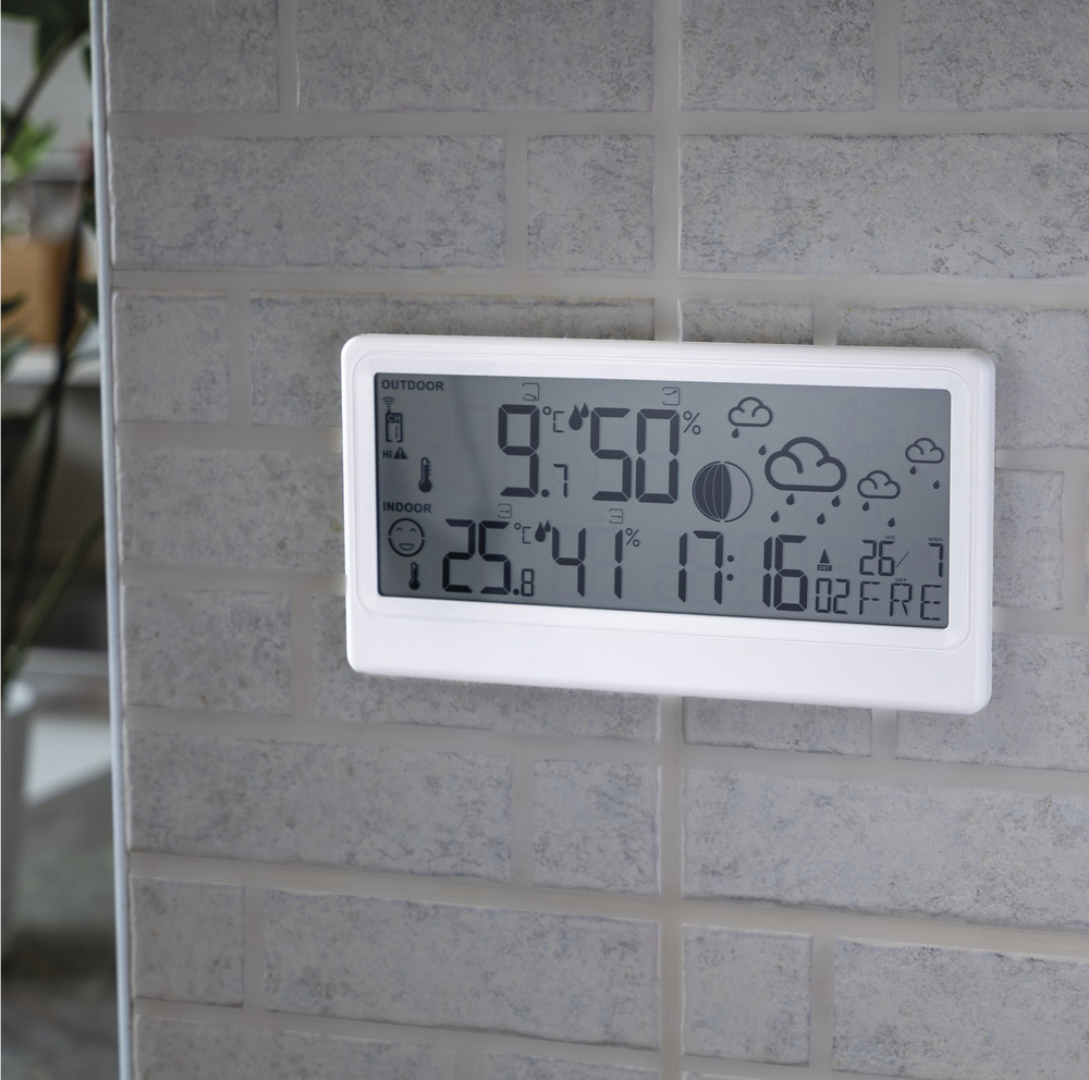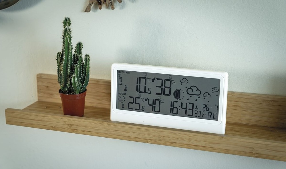 meteorologická stanice • napájení AA baterie • zobrazuje hodiny a datum • kalendář • jednobarevný LED displej • měří vnitřní i venkovní teplotu, vlhkost • teplotní výstrahy • fáze Měsíce • indikuje riziko vzniku plísní