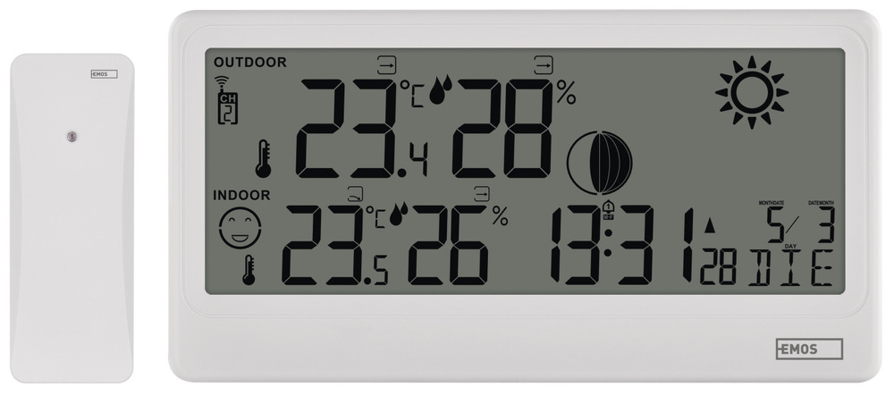 EMOS E0531Meteostanice EMOS E0531 je tedy vynikající volbou pro každého, kdo hledá spolehlivý nástroj pro sledování aktuálních podmínek ve své domácnosti. S množstvím funkcí, jako jsou teplotní výstrahy, předpověď počasí, a indikátor rizika vzniku plísní, se stane nezbytnou součástí vaší domácnosti. Velký a přehledný displej poskytuje všechny podstatné informace na první pohled. Díky jasnému zobrazení teploty, vlhkosti a dalších údajů budete vždy vědět, co se děje kolem vás. Ukáže také vnitřní a venkovní teplotu nebo fáze Měsíce. Poskytuje teplotní výstrahy, které vás informují o riziku mrazu nebo změnách počasí, které by mohly ovlivnit vaše aktivity. Navíc je k dispozici indikátor rizika vzniku plísní, který vám pomůže udržet váš domov zdravý a bez nežádoucí vlhkosti. Další cennou funkcí je zobrazení trendu tlaku. Díky možnosti postavení na stůl nebo zavěšení na stěnu je možné ji umístit podle potřeby kamkoli ve vaší domácnosti. Meteostanice je napájena třemi AA bateriemi, které je třeba zakoupit samostatně.