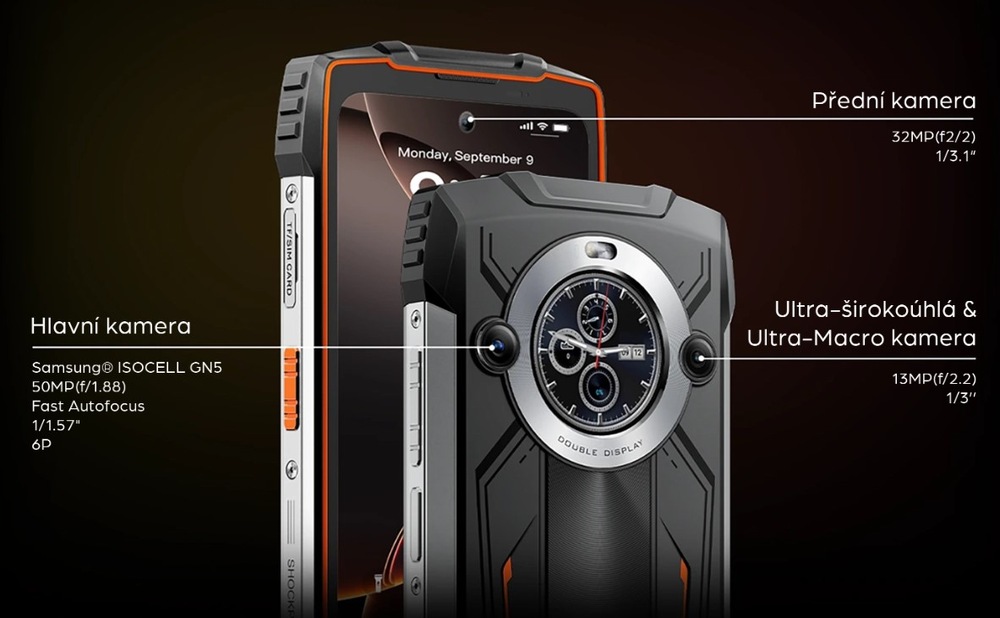 smartphone • 6,5" úhlopříčka • IPS LCD displej • 2400 × 1080 px • procesor Helio G100 (8jádrový – až 2,2 GHz) • paměť RAM 12 GB (+ 12 virtuální) • interní paměť 256 GB • dvojitý zadní fotoaparát 50 + 13 Mpx • přední fotoaparát 32 Mpx • dual SIM • NFC • Bluetooth • LTE • GPS • Wi-Fi • USB-C • 3,5mm Jack • zvýšená odolnost s certifikací IP68, IP9K, MIL-STD-810H • odemykání pomocí obličeje a otisku prstů • Android 14.0 • kapacita baterie 8 800 mAh • reverzní, rychlonabíjení 45 W