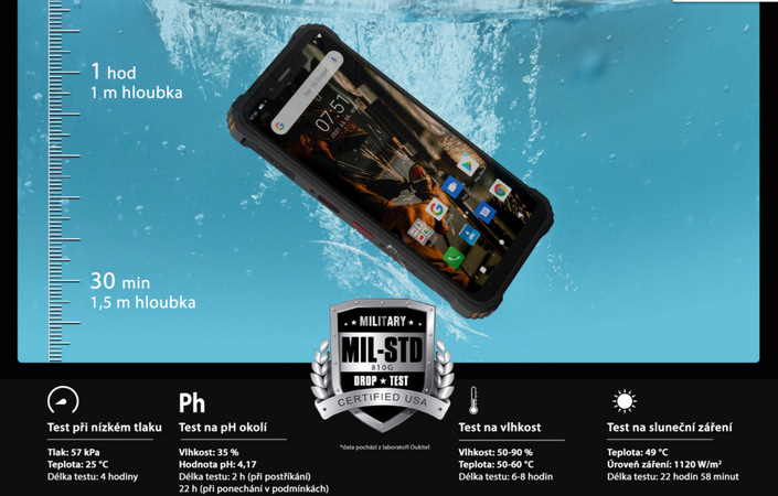 Kvalitní provedení se stupněm krytí IP69K a armádní certifikací MIL-STD-810G zaručí telefonu bezchybný provoz i v extrémních podmínkách. Zařízení se nepoškodí ani při ponoření do vody, v prašném prostředí nebo obecně při nešetrném zacházení.
