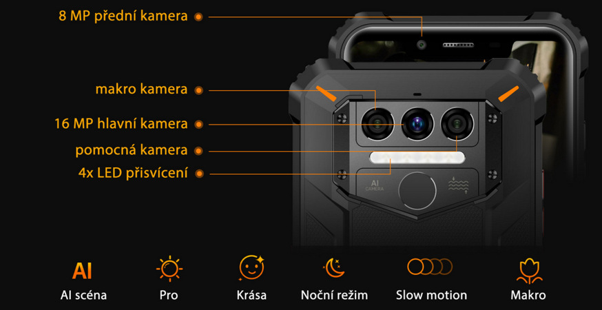 Oukitel WP9 je mimořádně odolný telefon plnící vojenské nároky, ale přitom také atraktivně vybavený smartphone se zajímavou výbavou a dlouhou výdrží. V těle má totiž baterii o kapacitě 8 000 mAh a nabízí šikovné funkce, jako je NFC pro bezkontaktní placení, reverzní nabíjení skrze USB-C nebo třeba čtečka otisku prstů a podpora dvou SIM současně. Jak můžete vidět, ve výbavě se ani přes vysokou odolnost ústupky neodehrály.
