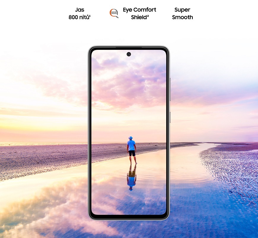 Vydejte se vstříc nevšednímu dobrodružství se Samsung Galaxy A52 5G. Jeho FHD+ Super AMOLED obrazovka vás uchvátí pulzujícími detaily, které díky 800 nitům uvidíte i během jasného slunného dne. Vaše oči budou chráněné před vyzařováním modrého světla díky Eye Comfort Shield a o skutečně plynulou zábavu na 6,5palcovém Infinity-O displeji se postará technologie Super Smooth.