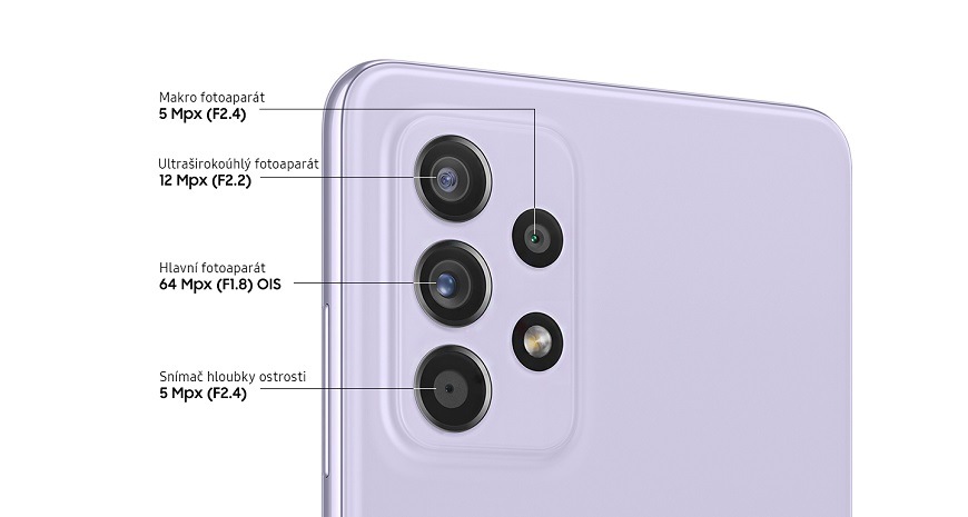 - Čtveřice zadních fotoaparátů (64 + 12 + 5 + 5 Mpx) a přední selfie kamera (32 Mpx)