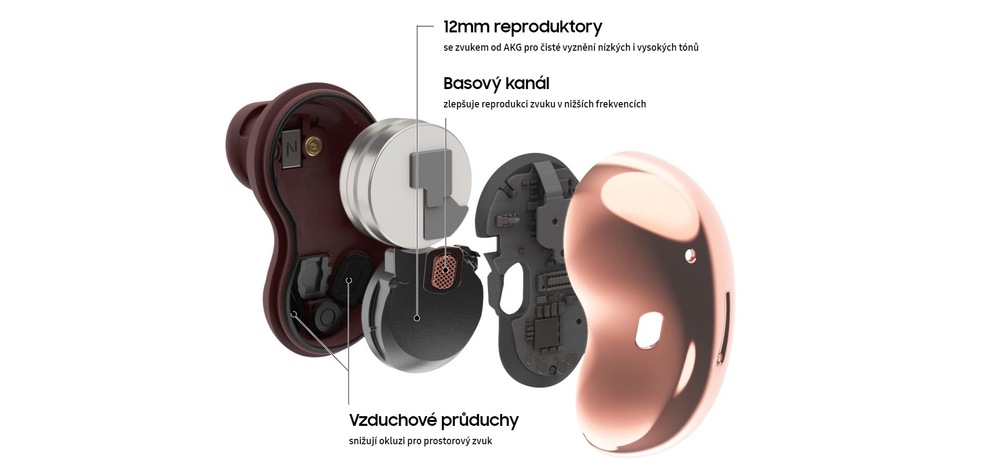 bezdrátová sluchátka • provedení true wireless • výdrž až 6 hod (samotná sluchátka) nebo až 21 hod (s nabíjecím pouzdrem) • 12mm reproduktory • pokročilé dotykové ovládání • možnost hlasového ovládání (asistentka Bixby) • Bluetooth 5.0 • integrovaný mikrofon • kompatibilní s telefony s OS Android i iOS