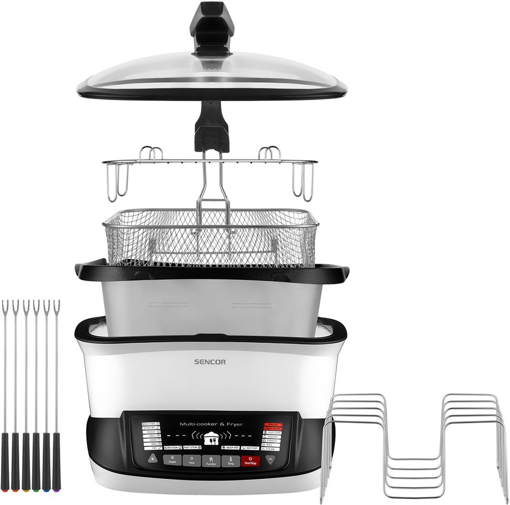 multifunkční hrnec • příkon 1 800 W • objem 4,8 l • funkce hrnce: fondue, griluje, jogurt, ohřívá, peče, pomalé vaření, rýžovar, smaží, vaří, vaří v páře • materiál: hliník • LED displej • 18 přednastavených programů • rozmezí teplot od 40 do 240 °C • funkce udržování teploty • odložený start • příslušenství: poklice, napařovací rošt, sous-vide rošt, 6× fondue vidličky, fritovací koš