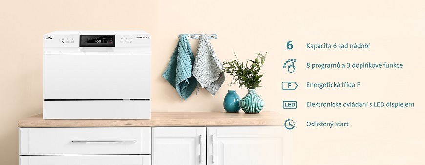 Vyberte si z bohaté nabídky osmi přednastavených programů. Zařízení je velmi kompaktní, nepotřebuje téměř žádný prostor. S kapacitou 6 jídelních sad a rozměry 43,8 × 55 × 52,5 cm se výborně hodí do malých domácností nebo samostatných pokojů. Myčka spadá do energetické třídy F, kdy spotřeba energie v programu ECO na 100 cyklů činí 61 kWh.