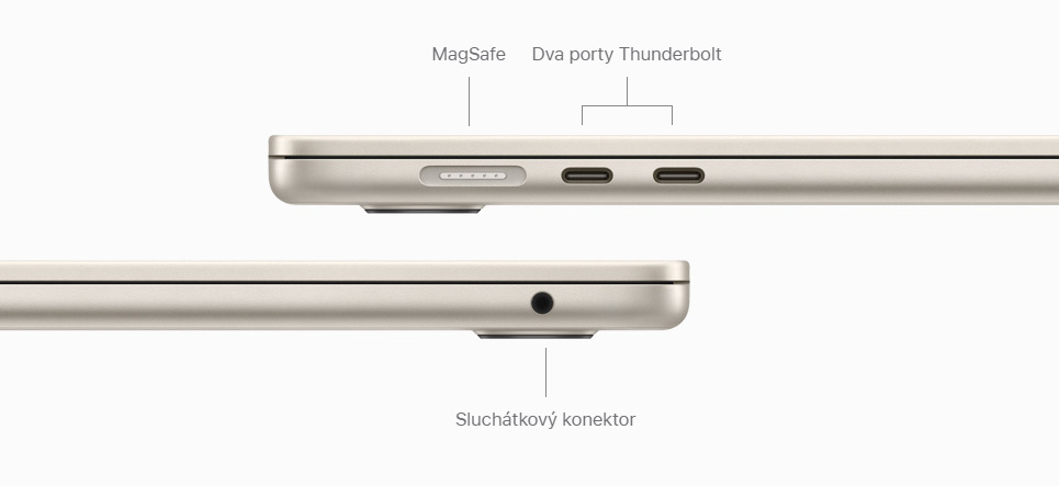 MacBook Air využívá skvělý nabíjecí konektor MagSafe, jenž zajistí intuitivní připojení díky magnetům. Nemusíte se obávat jeho vypojení, když o kabel zavadíte, na druhou stranu je připraven i na rychlé uvolnění, aby počítač nespadl na zem. Kromě toho jsou k dispozici i dva porty Thunderbolt s podporou superrychlých datových přenosů a až 6K monitorů!