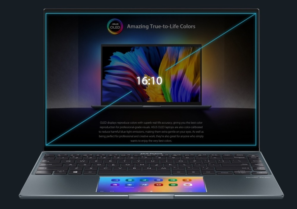 Asus přináší unikátní řešení pro všechny, kteří hledají výkonný a kompaktní notebook s dvěma displeji s nízkou hmotností a malými rozměry zároveň. Se svojí hmotností 1,4 kg a rozměry 31,1 × 22,1 × 1,7 cm notebook snadno uschováte do jakékoliv tašky. Po odklopení víka vás uchvátí dotykový 14" OLED panel s excelentním barevným podáním, rozlišením 2880 × 1800 px, praktickým poměrem stran displeje 16 : 10 a vysokým jasem až 400 nitů. Kvality displeje podtrhuje 100% DCI-P3 a certifikace DisplayHDR True Black 500. Displej navíc s certifikací Pantone Validated garantuje přesné barevné zobrazení Pantone. Extrémně tenké rámečky v sobě uschovávají webkameru s HD rozlišením.