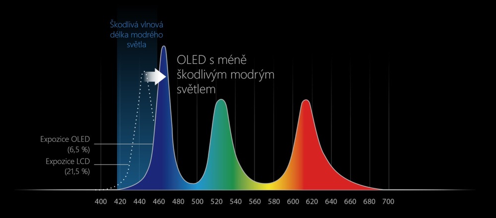 Modré světlo při dlouhodobém vystavení způsobuje zrakové potíže a narušuje kvalitu spánku. Díky speciální osvětlovací vrstvě v OLED displeji vyzařuje Zenbook o 70 % méně škodlivého modrého světla a splňuje tak certifikaci TÜV Rheinland a SGS. Na rozdíl od tradičních modrých filtrů však posun spektra neznamená kompromisy ohledně přesnosti barev.