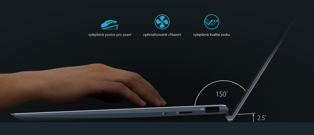 Při otevření víka se zadní část notebooku automaticky zvedne a nakloní klávesnici pro lepší úhel při psaní. Zároveň nadzvedá kovové šasi notebook pro lepší chlazení a vylepšenou kvalitu zvuku integrovaných reproduktorů s certifikací harman/kardon.