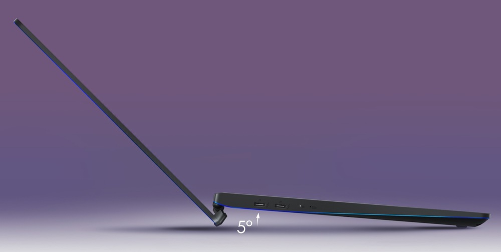 Aby bylo používání notebooku co nejpříjemnější, základna notebooku se při otevření displeje mírně nahne, což má za následek pohodlnější psaní na klávesnici a zároveň zlepšení proudění vzduchu pro efektivnější chlazení.