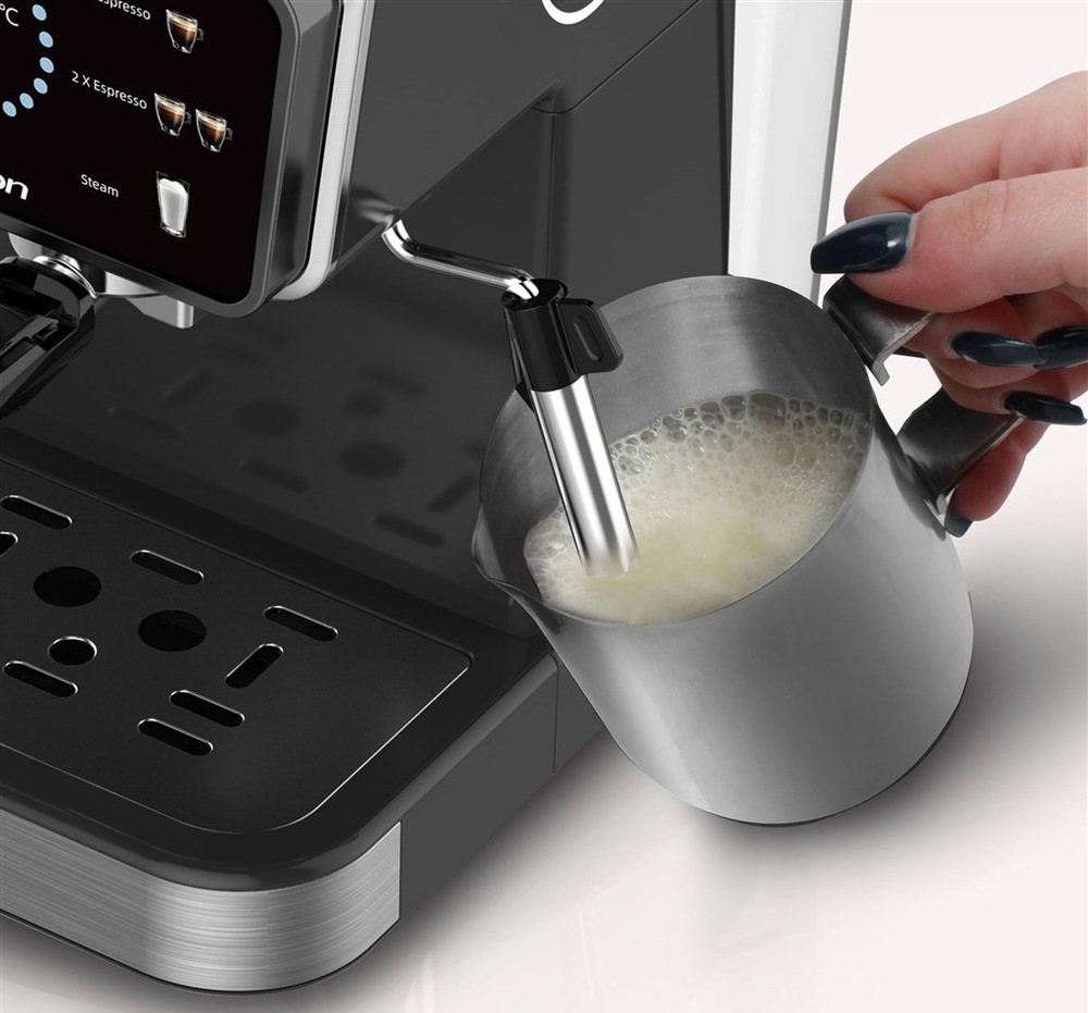 Přístroj disponuje profesionálním tlakem přípravy 20 barů, dvojitým řízením teploty a systémem dvojí extrakce pro horkou i studenou kávu. Na čelním ovládacím panelu jednoduše zvolíte požadovaný typ kávy, pomocí trysky snadno dodáte porci dokonale napěněného mléka. V balení kávovaru naleznete sítka pro přípravu jednoho nebo dvou šálků kávy, abyste v jednom čase mohli připravit kávu svému partnerovi nebo návštěvě. Pro větší každodenní radost z používání jsou všechny díly odnímatelné a snadno přístupné, čímž je zajištěna rychlá údržba. Bezpečné a efektivní používání obstará energeticky úsporný systém ERP a automatická ochrana proti přehřátí a přetlaku.