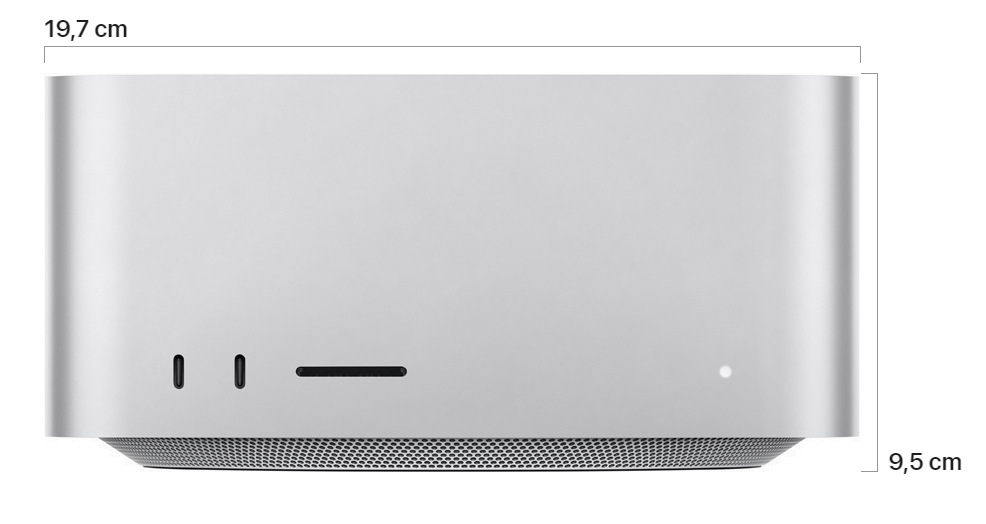 stolní počítač • procesor Apple M2 Ultra (24jádrový) • 60jádrová grafická karta • uložiště SSD 2 TB • paměť RAM 192 GB • Wi-Fi 802.11ax, Bluetooth 5.3 • 4× Thunderbolt 4, 2× USB-C, 1× 10Gb ethernet, 2× USB-A, 1× HDMI, 3,5mm jack • čtečka paměťových karet • integrovaný reproduktor • operační systém macOS
