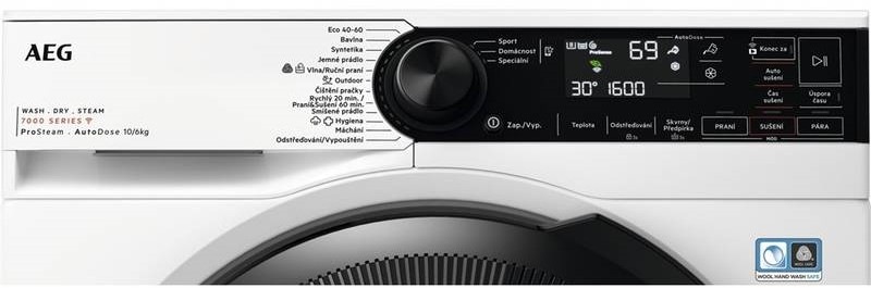 pračka se sušičkou • kapacita praní 10 kg / sušení 6 kg • energetická třída D • 1 600 ot./min. • doživotní záruka na ökoinvertorový motor • český panel • AutoDose – pro přesné dávkování pracího prostředku • parní praní Steam Refresh • technologie Wash-To-Dry – péče o jemné materiály • PreciseLoad – přizpůsobí cyklus aktuálním naplnění • chytrá diagnostika • 12 programů • odložený start • mobilní aplikace My AEG Care • ochrana proti úniku vody • V × Š × H: 84,7 × 59,7 × 63,1 cm