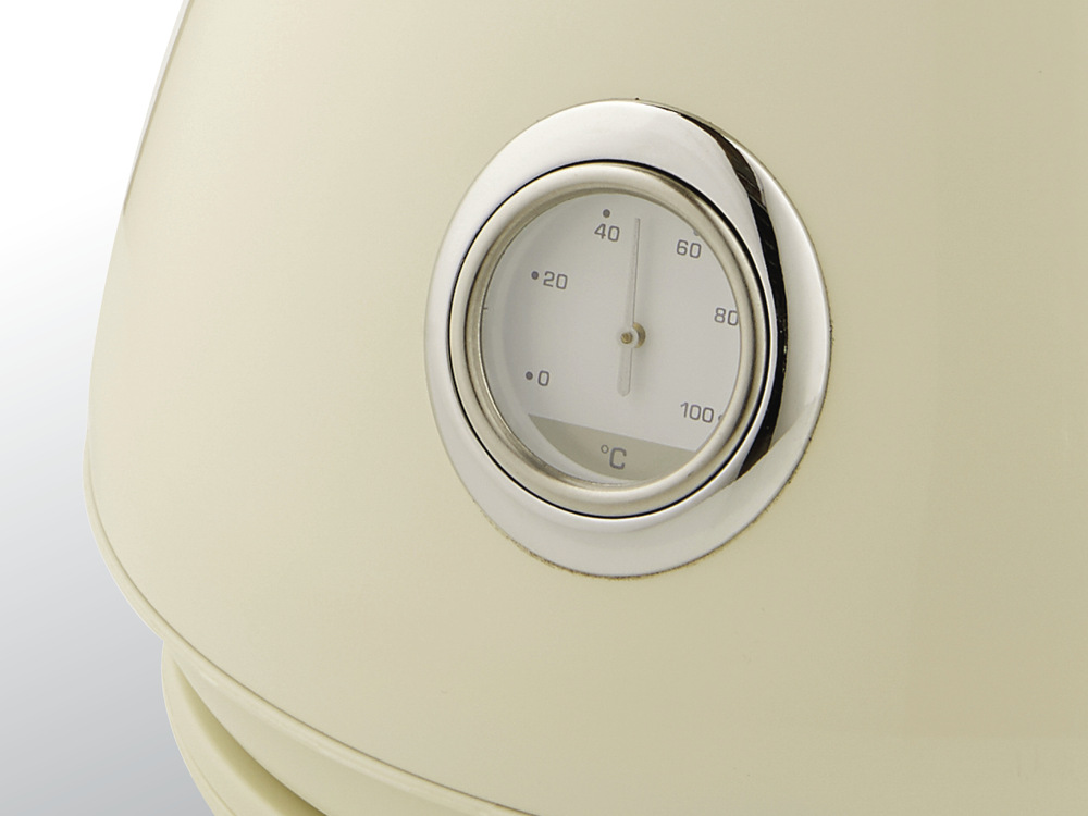 Retro design konvice je doplněný o elegantní, analogový teploměr. Ručička teploměru vám vždy spolehlivě ukáže, kolik stupňů voda přesně má. Vy tak můžete vypnout ohřev, když voda dosáhne teploty, kterou bude váš oblíbený nápoj vyžadovat.