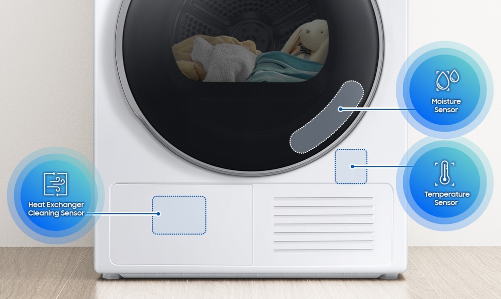 O prádlo v sušičce Samsung se strachovat nemusíte. Je o něj dobře postaráno díky trojici senzorů technologie OptimalDry, která monitoruje vlhkost a optimalizuje dobu sušení pro ještě větší úsporu energie. A až nadejde čas na vyčištění výměníku tepla, upozorní vás na to.