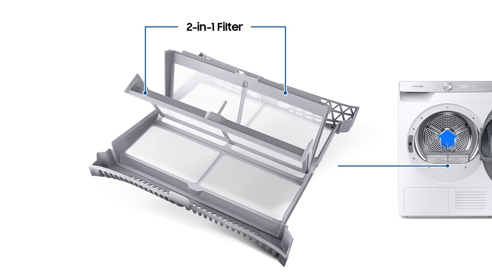 Bezpečná, výkonná a téměř bezúdržbová. Sušička Samsung je vybavena filtrem 2 v 1 s dvouvrstvým síťovým filtrem, takže filtr výměníku tepla není zapotřebí, což značně usnadňuje údržbu sušičky. V případě potřeby čištění filtru a výměníku tepla vás upozorní dvojice praktických alarmů.