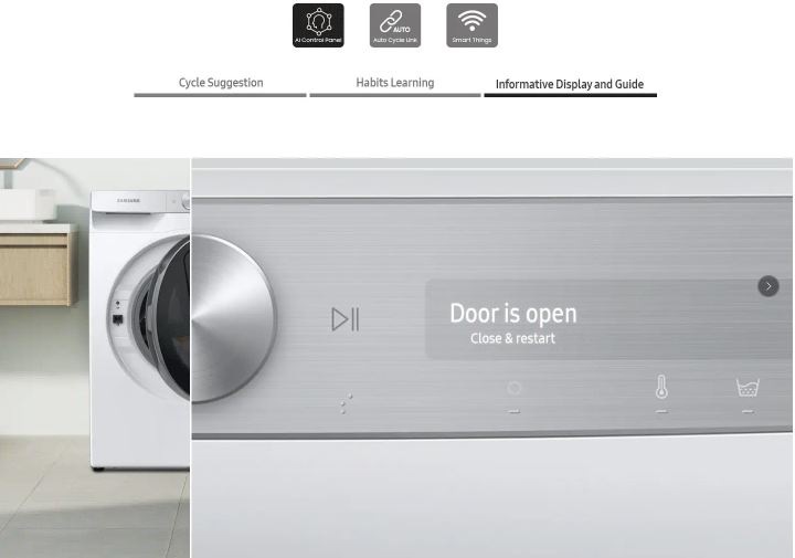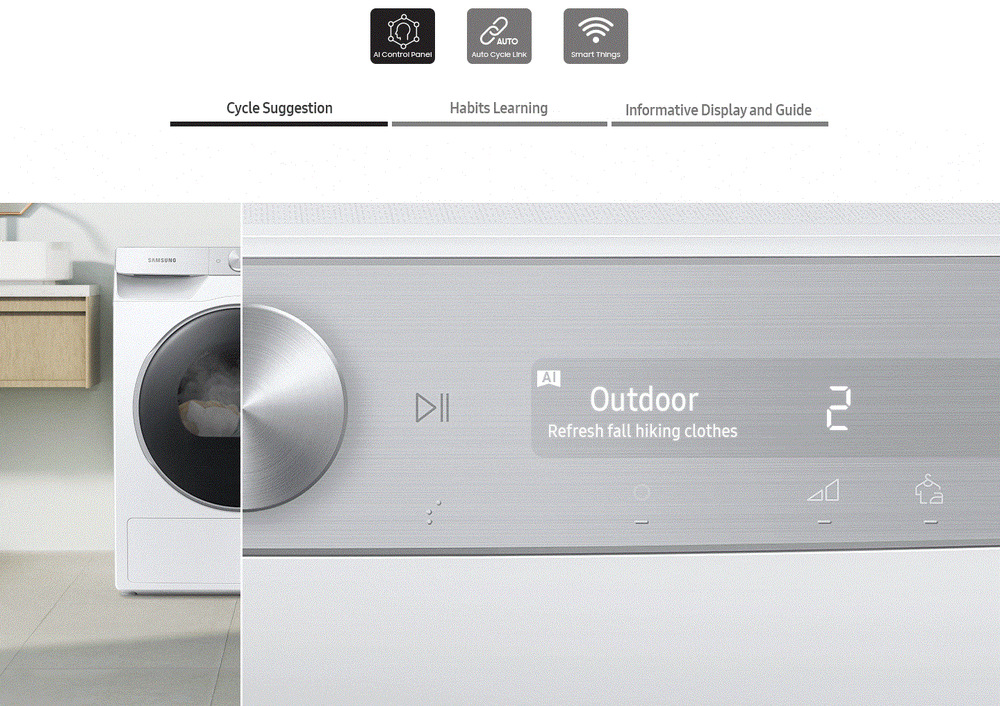 Cyklus Hygiene Steam zvyšuje kvalitu praní, a to bez předpírky. Vypouští ze dna bubnu páru, která prostoupí každý kousek oblečení a odstraňuje uchycené nečistoty, 99,9 % bakterií a alergenů. Technologie Eco Bubble vytvoří z pracího prostředku aktivní pěnu a postará se o dokonalý výsledek i při nízkých teplotách praní. Praní bude ještě jednodušší s inteligentní funkcí AI Control, která si pamatuje vaše návyky a sama vám navrhne nejvhodnější prací cyklus. Pro ještě pohodlnější ovládání lze pračku ovládat přes mobilní aplikaci SmartThings.
