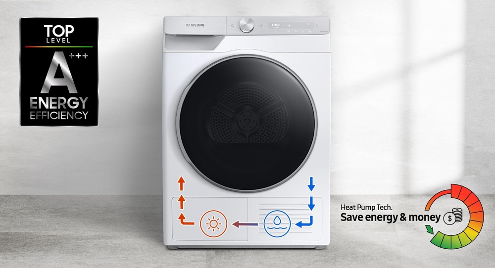 V moderní domácnosti je neskladný sušák na vyprané prádlo minulostí. Pořiďte si sušičku Samsung a ušetřete svůj čas, životní prostředí, spotřebu energie i svou peněženku. Sušička je osazena technologií tepelného čerpadla, které zaručuje energetickou efektivitu a šetrný způsob sušení různých tkanin. Vzduch ohřívá pomocí „chladiva“ a recyklace teplého vzduchu zajišťuje ještě větší úsporu energie, díky čemuž si vysloužila zařazení do energetické třídy A+++.