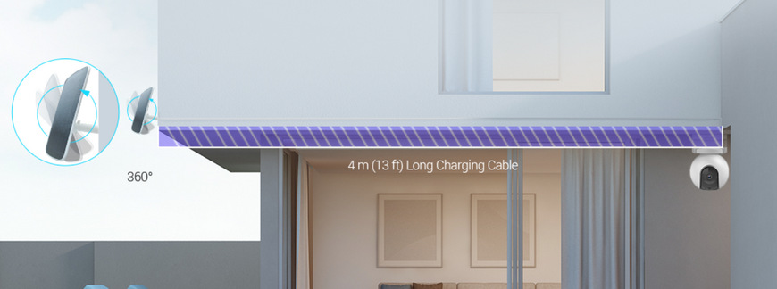 Oceníte také nastavitelný držák otočný o 360 stupňů v kombinaci se 4 metry dlouhým kabelem. To znamená maximální flexibilitu při instalaci na slunné místo poblíž vaší kamery.