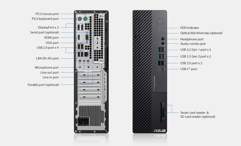 Asus ExpertCenter D7 SFF je stolní počítač, který je vhodným doplňkem domů i do kanceláře. Nabízí stabilní a plynulý provoz vhodný pro každodenní pracovní úkony. Tento model je dostupný s operačním systémem Windows 11 Pro, který vyniká přehledným prostředím pro intuitivní a snadnou každodenní práci i pohodlné používání ve volném čase. Počítač pohání čtyřjádrový procesor Intel Core i3-12100 spolu s 8GB operační pamětí. Na přední i zadní straně najdete konektory pro připojení externích zařízení, např. HDMI, VGA, USB, USB-C, čtečku karet, Ethernet a podobně. Nechybí zde ani DVD mechanika pro přehrávání CD a DVD nosičů.