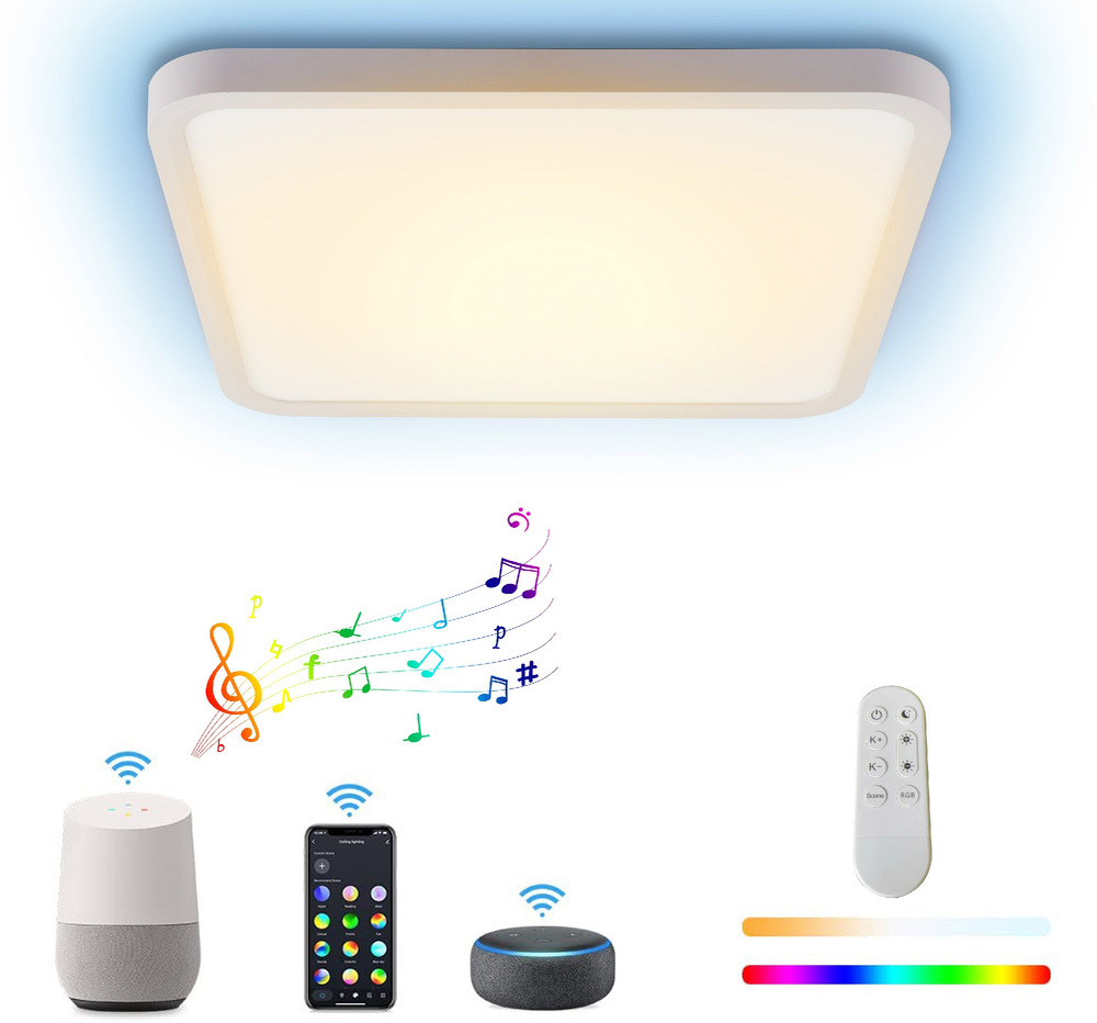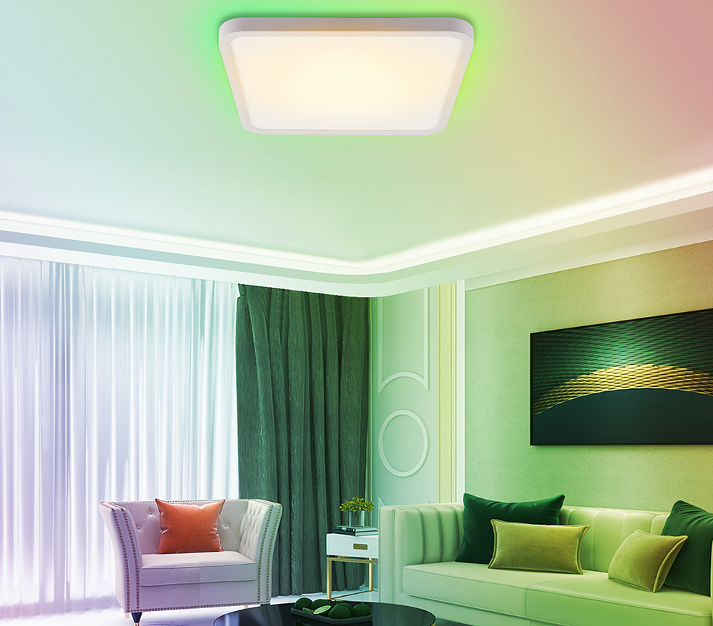 stropní svítidlo • energetická třída F • nastavitelný jas • LED technologie • kompatibilní s Android/iOS • do chodby, ložnice nebo dětského pokoje • ovládání: mobilní aplikací • IP ochrana: krytí IP20 • odstíny bílého světla • RGB podsvícení • výkon 50 W • V × Š × H: 40 × 40 × 3,5 cm
