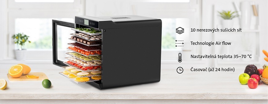 - Příkon 650 W, 10 nerezových sušicích sít nad sebou