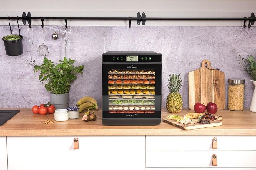 Susička ETA Vital Air II vás příjemně překvapí nejen svou výkonností, ale také širokou škálou využití. Kromě samotného sušení potravin ji lze využít i při kynutí těsta, výrobě domácích těstovin, domácího jogurtu nebo při rozpékání pečiva. V sušičce naleznete 10 nerezových sušících sít, jejichž počet lze upravovat dle aktuálního množství surovin. Na přehledném LCD displeji si můžete nastavit teplotu sušení v rozmezí od 35 do 70 °C (s krokem po 5 °C).