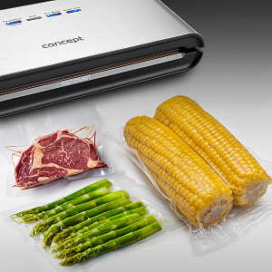 Vakuová svářečka fólií Concept VA0040 je praktickým pomocníkem, se kterým prodloužíte životnost a čerstvost skladovaných potravin a zároveň uspoříte místo v lednici či mrazáku. Spotřebič o příkonu 120 W je vhodný pro vakuování suchých i vlhkých potravin, jelikož disponuje zásobníkem pro zbytkovou vlhkost. O jaký druh potraviny se jedná, si vyberete pomocí tlačítek doplněných o LED podsvícení, takže ovládání je velmi snadné. Navíc můžete zvolit funkci Turbo pro ingredience s vyšší tvrdostí a naopak Normal pro ty měkčí, které by velký tlak poškodil.