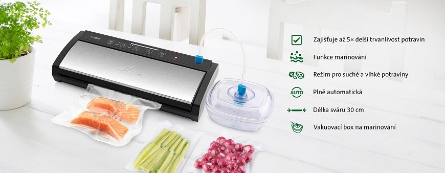- Plně automatická: uzavřením pevně zajistí fólii, odsaje vzduch a zataví spoj