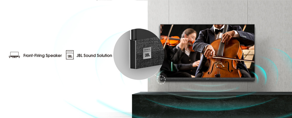 Tento model má na rozdíl od většiny běžných TV reproduktory umístěny na přední straně. To znamená, že nedochází k takovým ztrátám zvuku. Na vysoké kvalitě audio projevu má velký podíl také spolupráce s JBL. Výsledkem toho je, že si své filmy, seriály, hudbu i sport nebo hraní užijete opravdu naplno.