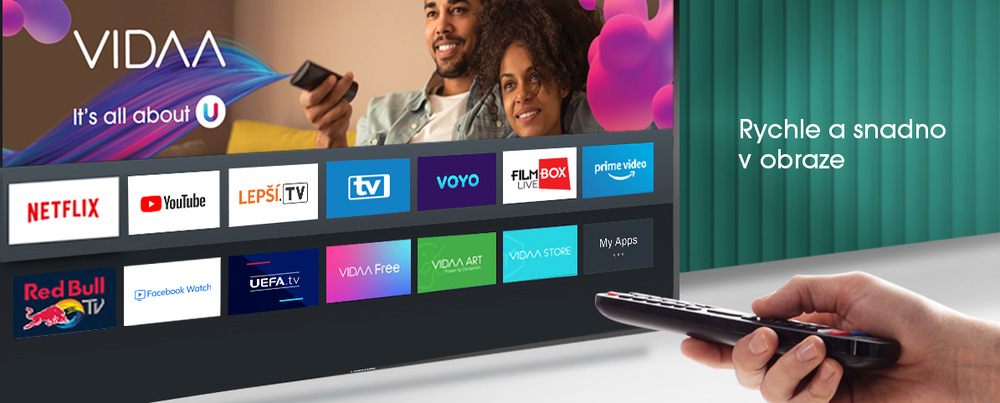 - Chytré funkce Smart TV prostřednictvím systému VIDAA U4, včetně Netflixu nebo Amazon Prime a YouTube