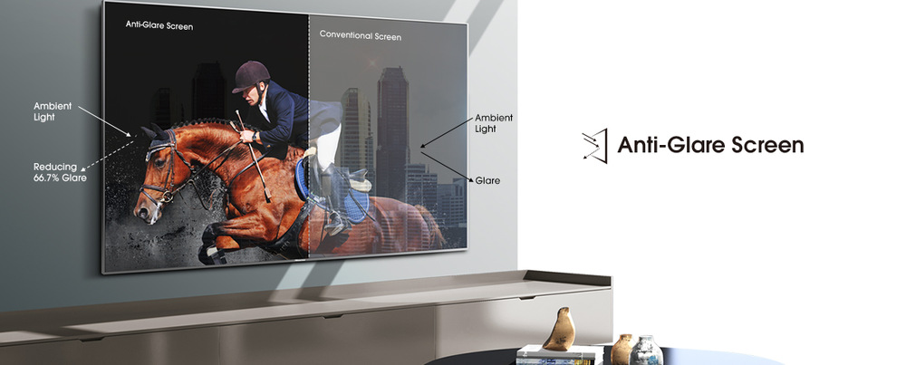 Obrazovka se pyšní prémiovou úpravou Anti-Glare, která dokáže absorbovat až 98,5 % světla a odráží jen 1,5 %. To znamená, že už vás od perfektní podívané nebudou rušit nežádoucí odlesky. Ty totiž oproti běžným TV redukuje s účinností vyšší o 66,67 %.
