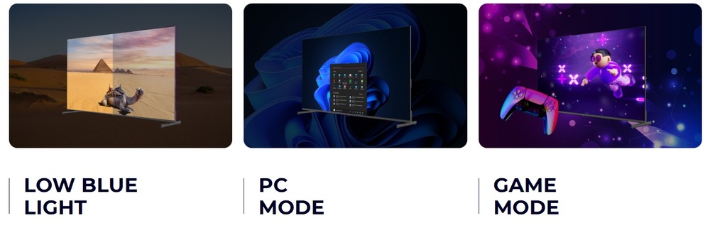 Podle toho, jaký obsah sledujete, si vyberte správný režim zobrazení, aby obraz vynikl naplno, a vy jste si ho mohli užít na maximum. Přístroj nabízí režim s nízkým obsahem modrého světla, který se hodí pro dlouhodobé sledování, abyste se necítil brzy unavení. PC režim přizpůsobí zobrazení tak, aby televize fungovala jako monitor. Herní režim vám přináší bleskově rychlé reakce a plynulý obraz i během napínavé soutěžní akce.