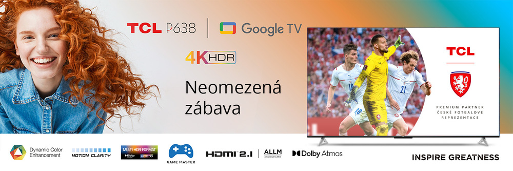 TCL 50P638Řada TCL P638 – televizor s 4K HDR rozlišením, který podporuje také nejmodernější obrazový formát Dolby Vision HDR, což zajišťuje jemné detaily a přehrávání všech scén, abyste si mohli vychutnat Netflix, HBO Max, Apple TV, Amazon Prime Video nebo Disney+ v nejlepší možné kvalitě. Zásluhou VA panelu a Direct LED podsvícení budete mít hlubokou černou a vysoký kontrast, zatímco HDMI 2.1 a Game Master optimalizují hry pro nejlepší možnou grafiku a odezvu. Podporuje pokročilé formáty prostorového zvuku Dolby Atmos a DTS-HD a zároveň běží na Google TV s rozsáhlou nabídkou aplikací a vestavěnými funkcemi, jako je Chromecast a Google Assistant. Moderní design, kovová povrchová úprava a bezrámová konstrukce zajišťují skvělou odolnost a nadčasový styl.