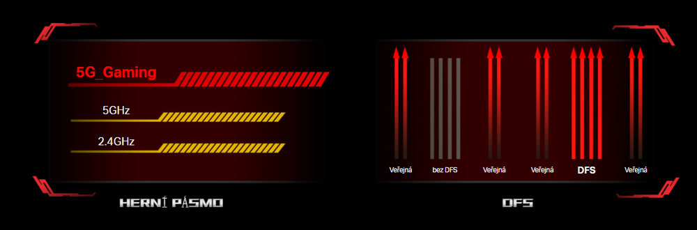 Router má pro hry vyhrazené samostatné pásmo, abyste mohli nerušeně hrát a zbytek rodiny mohl současně sledovat internetovou televizi bez ztráty kvality. Funkce DFS neboli dynamický výběr frekvence umožňuje rozšíření pásma dostupného kanálu a přejíždění do volnějšího pruhu, abyste využili dostupné rychlosti na maximum.