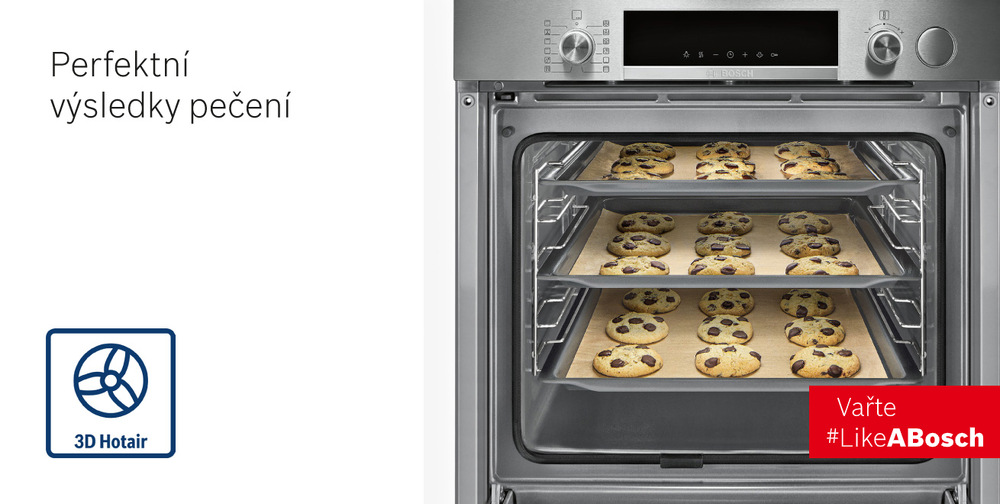 V troubě Bosch proudí 3D horký vzduch, který umožní péct různé druhy pokrmů až na třech úrovních najednou. Teplo se rozpíná rovnoměrně a rychle po celém vnitřním prostoru trouby. Vy tak můžete péct najednou pizzu, ovocný koláč a vepřovou panenku. Chutě se nebudou mísit dohromady.