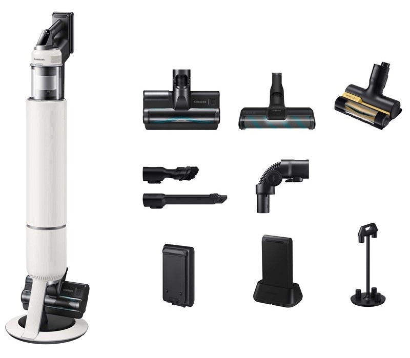 tyčový a integrovaný ruční vysavač • napájení: Li-Ion, výdrž až 60 min. • HEPA filtr • objem odpadní nádoby 0,5 l • LCD displej • LED osvětlení na hubici • AI režim • mobilní aplikace Smartthings • nejdůležitější příslušenství: automatická stanice, flexibilní nástavec, hubice Pet Tool+, štěrbinová hubice s kartáčkem 2 v 1