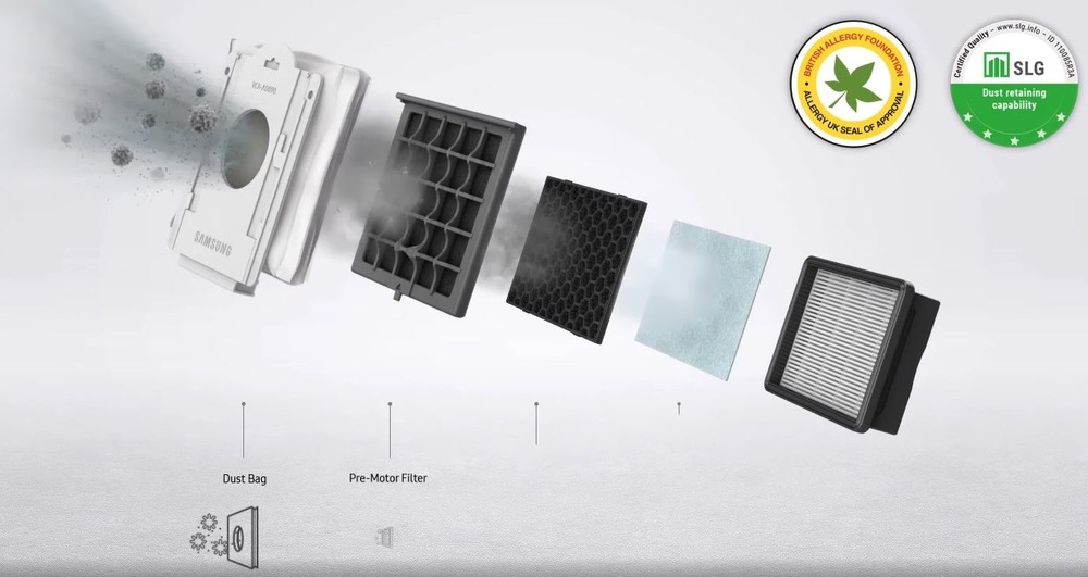 Stanice je opatřena vícevrstvým filtračním systémem s účinností 99,999 %, který zachytí téměř všechny alergeny a prachové částice. Předmotorový filtr zachytí velké i malé částice prachu.