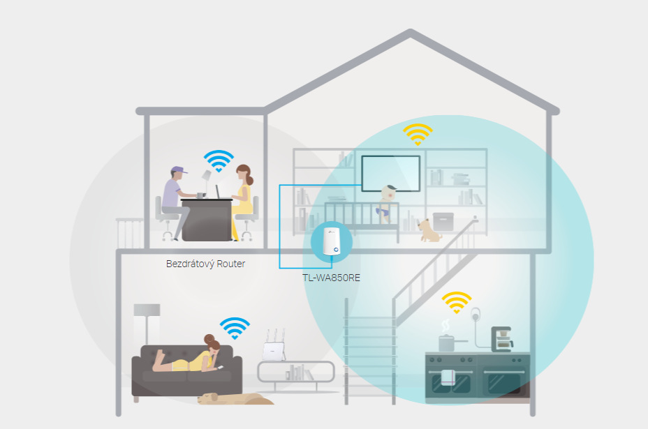 RE300 se bezdrátově připojí k vašemu routeru a dokáže výrazně rozšířit signál tam, kde aktuálně není. Dosahuje přitom rychlosti až 300 Mb/s.