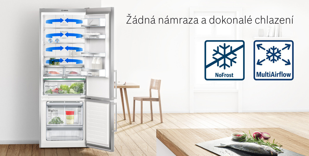 Díky funkci NoFrost už nebudete muset chladničku nikdy odmrazovat. NoFrost vám tak ušetří čas a námahu. Systém MultiAirflow produkuje pozvolné a rovnoměrné proudění studeného vzduchu, který zasahuje do všech úrovní chladničky i mrazničky. Minimální kolísání teploty a déle trvající chuť a aroma potravin.