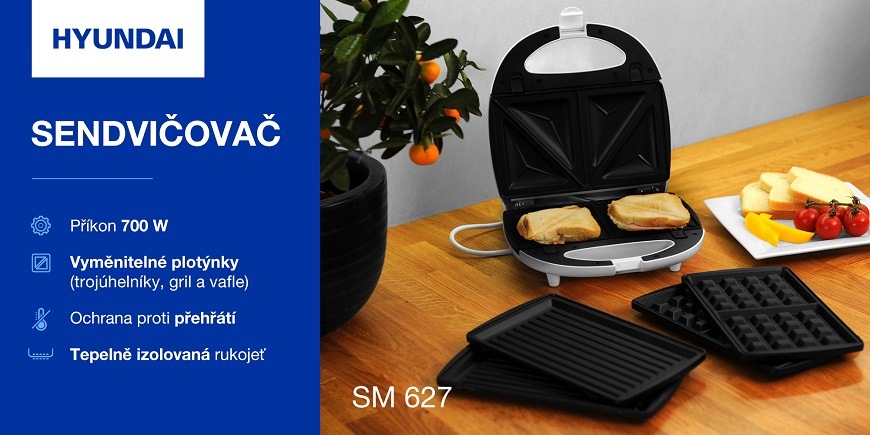 Co si dáte k snídani? Často koukáme do ledničky a skončíme u jogurtu nebo housek. Velmi snadno si však můžete jídelníček rozšířit, pokud z chleba vytvoříte chutné toasty naplněné tím, nač máte právě chuť. Tím však pole působnosti Hyundai SM 627 nekončí – tahle mašinka zapeče sendviče, připraví vafle a zvládne i grilovat.