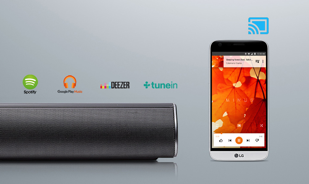 Software Chromestat vám umožní poslouchat miliony písniček, rádiových pořadů nebo stanic puštěných v telefonu přímo na soundbaru. Využijte svůj smartphone jako dálkový ovladač. Hledejte, přehrávejte a pozastavujte hudbu, nebo libovolně upravujte hlasitost.