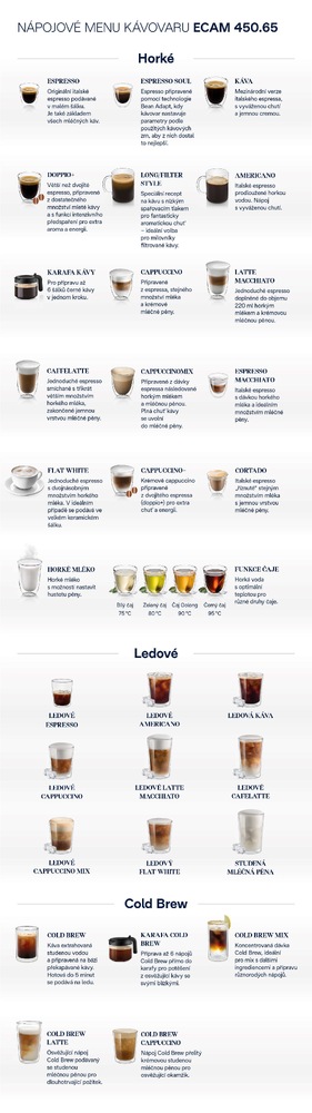 V jediném přístroji se nachází tolik funkcí, že se vždy dočkáte požadovaného typu nápoje bez ohledu na osobní preference či náladu. K dispozici je více než 50 horkých i ledových nápojů, mezi nimiž nechybí espresso, cappuccino, latte, americano, filter, ledová káva, mléko, čaj, horká voda a další. Se 4 uživatelskými profily může mít každý člen rodiny v kávovaru nastavenou svou oblíbenou kávu s ideální velikostí, přesným poměrem kávy a mléka v požadované teplotě.