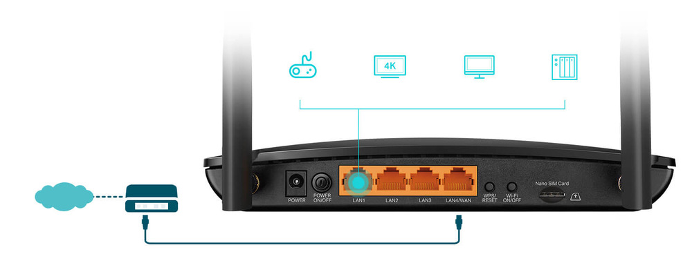 Kromě bezdrátového připojení máte k dispozici také porty, které se nachází na zadní straně routeru. S podporou gigabitových rychlostí můžete přes kabel připojit konzoli, televizi, počítač, datový systém a mnoho dalších zařízení, která nepodporují bezdrátovou technologii Wi-Fi.