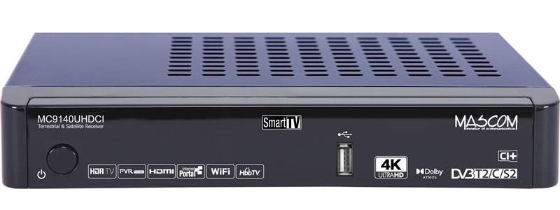 Mascom MC9140 je univerzální přijímač digitálního pozemního (DVB-T2), satelitního (SAT), kabelového a internetového televizního vysílání, který nesmí chybět v žádné domácnosti. Díky široké univerzálnosti je přijímač vhodný ke všem typům připojení a nabízí podporu HBB TV a smart aplikací. Součástí přijímače je nabídka internetových aplikací, jako je například YouTube, Oneplay, SledováníTV, Skylink, LiveTV, Twitch a mnoho dalších. Přijímač disponuje HDMI výstupem s upscalingem rozlišení až na 4K rozlišení (3840 × 2160 px) a digitálním audio výstupem pro připojení do systému domácího kina.